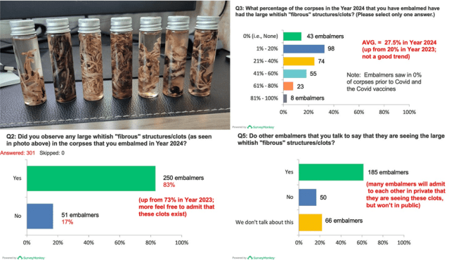 83% (250 embalmers) reported seeing large, white, fibrous clots in corpses during 2024, up from 73% in 2023.