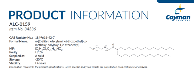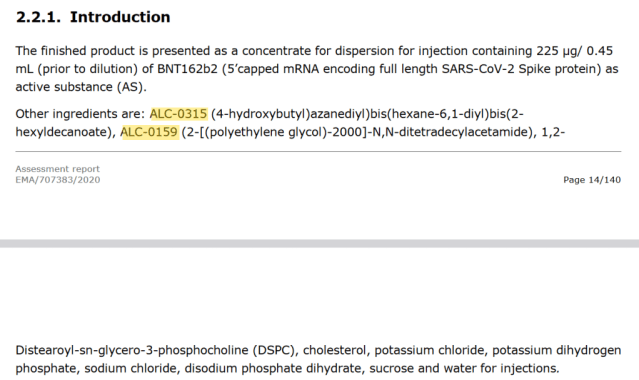 Two of the lipids in Pfizer Covid-19 vaccines are ALC-0159 and ALC-315, as confirmed by the assessment report of the Pfizer Covid-19 vaccine published by the European Medicines Agency.