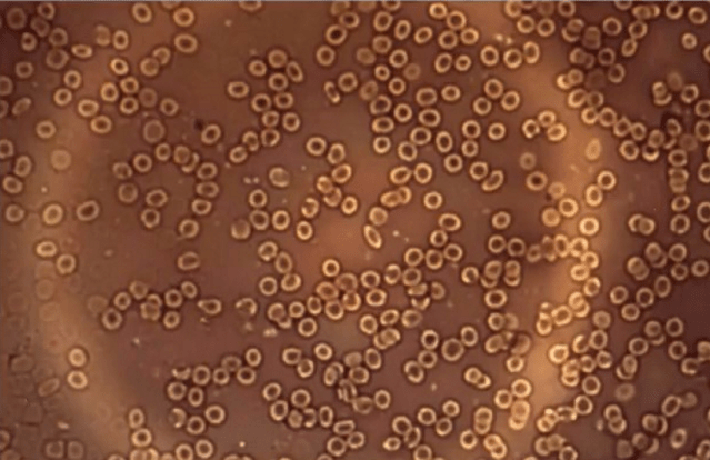 Below is an image, taken from Dr. Philippe van Welbergen’s study, of typical healthy red blood cells as seen with a microscope, what blood should look like. There is no coagulation or foreign objects in it.